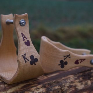 В своей мастерской я изготовляю стремена типа «вестерн» из твердых пород дерева, например, из дуба, бука, ясеня и других. Стремена полностью изготавливаются вручную и преимущественно из резных ламелей, ни в коем случае из лущеного или строганного шпона. Поэтому мои стремена имеют максимум 4 слоя, т.е. 3 проклеенных стыка. Это достаточное количество слоев для обеспечения прочности формы и для устранения некоторых дефектов древесины, которые могут повлиять на прочность. Но при этом наслаивание в конструкции стремени почти незаметно, потому стремя сохраняет свой «деревянный вид».
